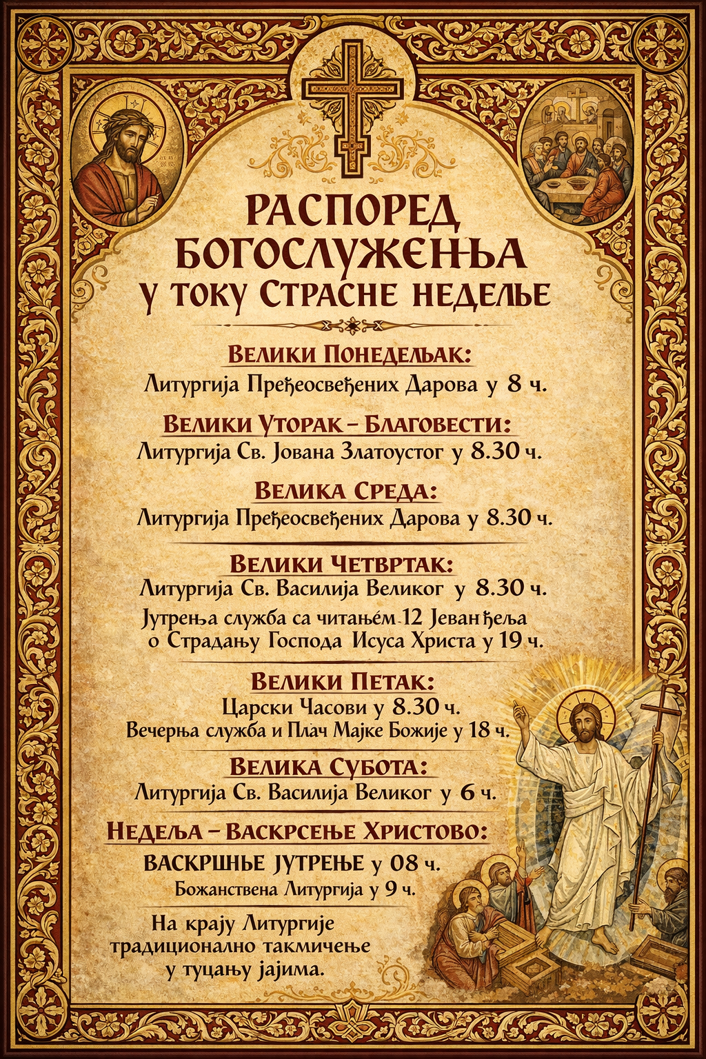 - Распоред Богослужења у току Страсне Недеље и на Празник Васкрсења Христовог