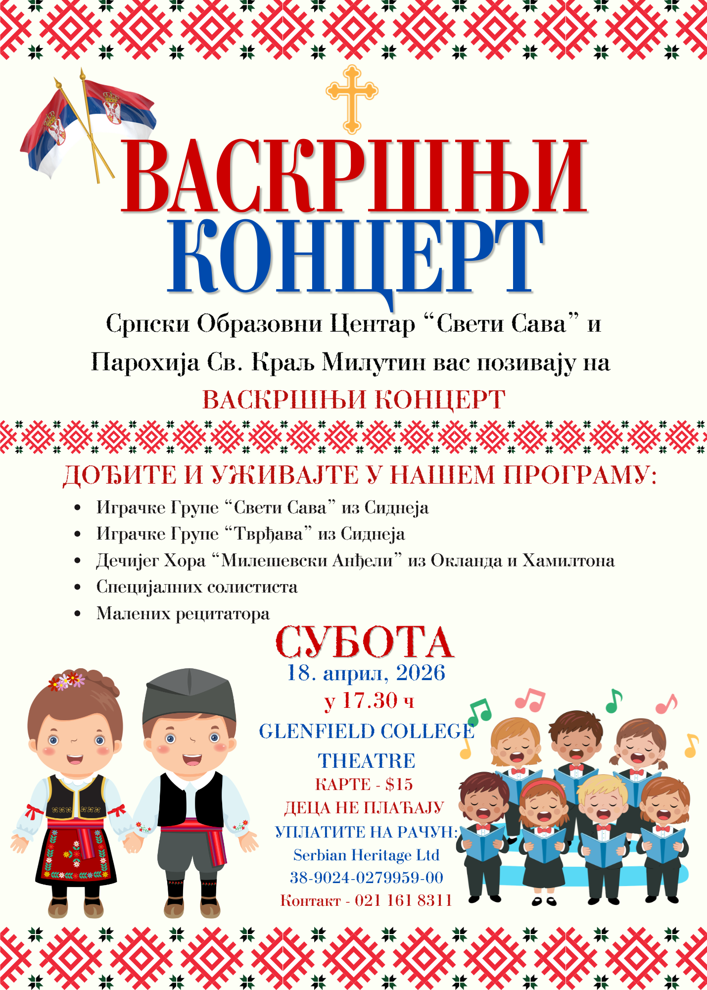 - Васкршњи концерт – Субота 18. април – 17:30 – Glenfield college